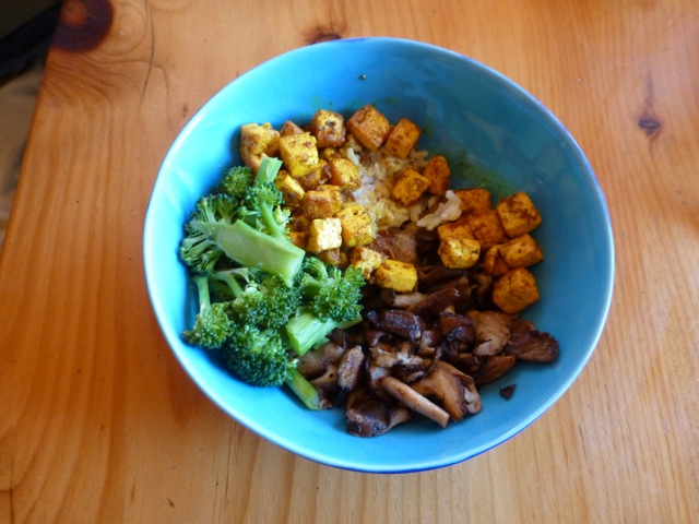 Tofu with turmeric and ginger and black pepper, shiitake mushrooms, broccoli, and brown rice.